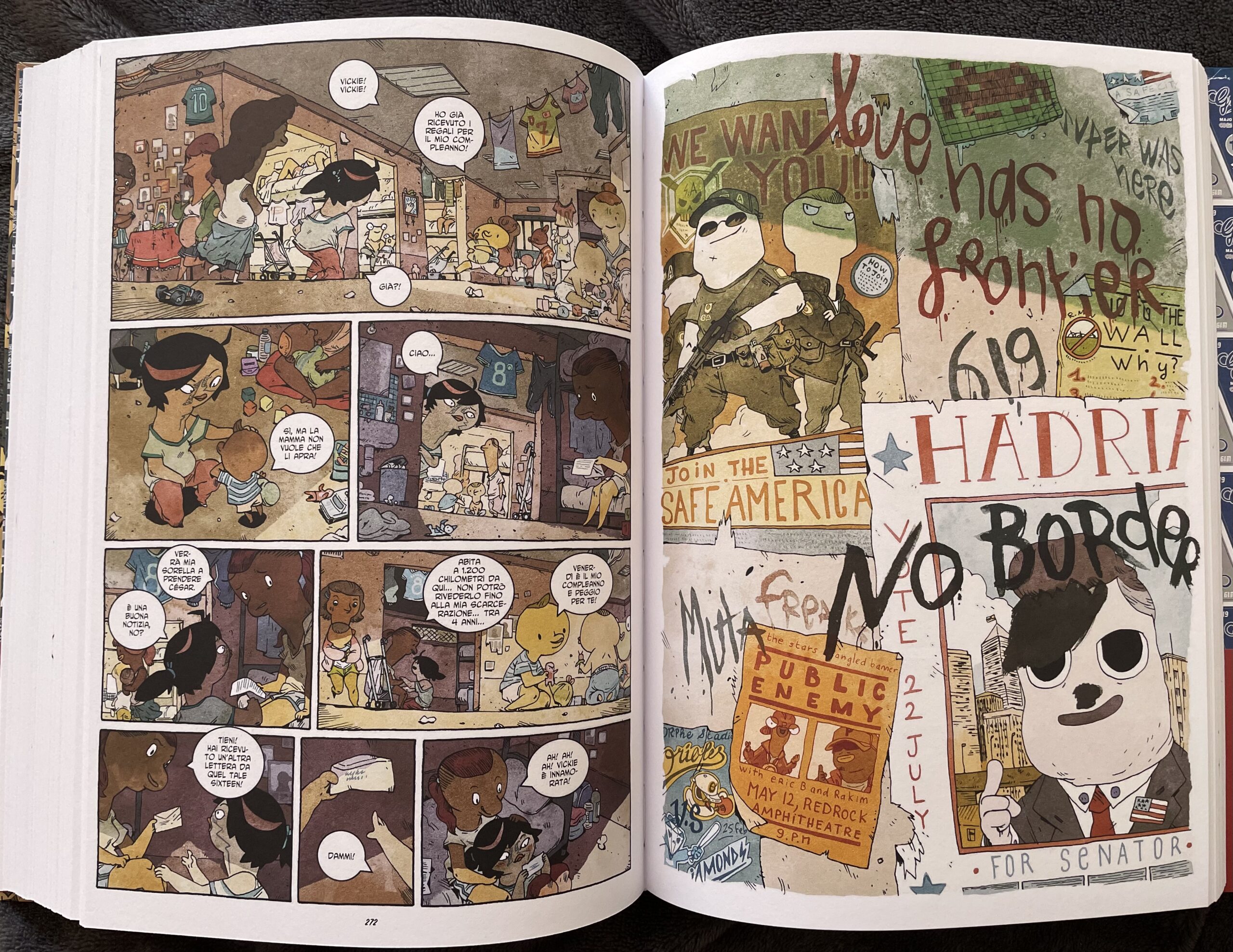 Attraverso la storia di Samuel, ad esempio, gli autori evidenziano lo strapotere delle banche e le leggi che permettono loro di espropriare i cittadini dalle loro case, creando situazioni di estremo disagio nella popolazione più povera. L’attivismo è l’unico modo per provare a opporsi a queste ingiustizie, ma ci si deve scontrare con la forza e l’indifferenza dei potenti, che invece di provare a risolvere la situazione, scelgono di non guardare e di erigere un muro.