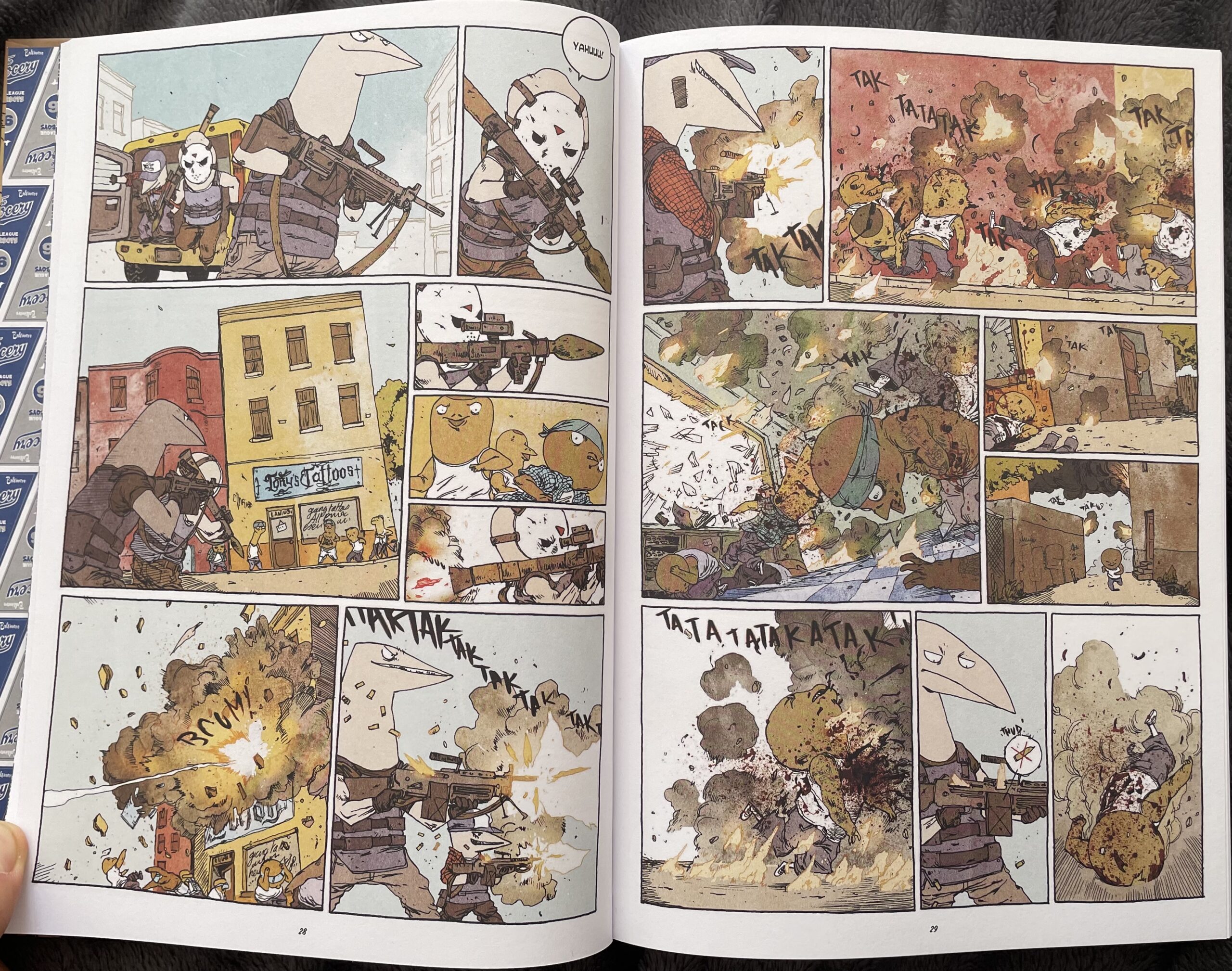 Non è strano pensare che The Grocery possa essere un’opera tanto amata da Zerocalcare. C’è la politica, ci sono le tematiche sociali, il disegno stilizzato, eppure preciso nel contestualizzare la storia, e anche un po’ di ironia…tutti elementi che ritroviamo spesso nelle sue opere. Al tempo stesso, ci sono altrettante differenze nell’approccio e i due autori francesi non si risparmiano nel mostrare la violenza. Un grande merito va riconosciuto a Bao Publishing, che ha deciso di inaugurare la nuova collana con un titolo tutt’altro che scontato, a partire dalla mole. Una lettura non leggera, ma dai disegni fantastici e con una trama davvero coinvolgente e stratificata. Ora aspettiamo la seconda “bomba carta”, sicuri che verremo sopresi con un altro titolo inaspettato!