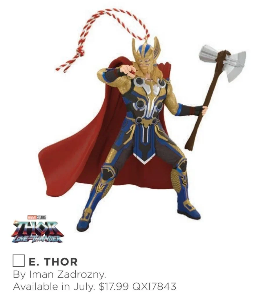 Questa nuova immagine del costume arriva in rete grazie a una fonte inaspettata. Qualche mese fa, la Marvel aveva già rivelato il nuovo costume blu tramite la nuova sua linea di giocattoli. Ma nelle scorse ore ci ha pensato Hallmark, mostrando un nuovo ornamento per l’albero di Natale, ha rivelare nella sua interezza il nuovo super-costume di Thor. Possiamo vedere l’amato personaggio mentre indossa il nuovo costume blu e l’elmo e brandisce il potente Stormbreaker!