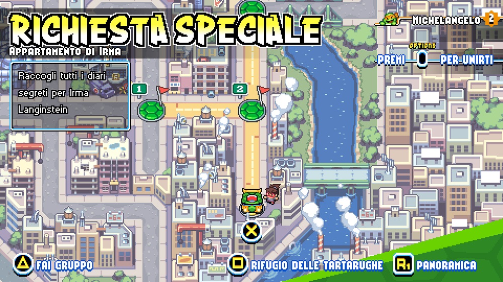 Inoltre, ogni livello offre un certo numero di sfide e collezionabili. Per completare le prime non dovremo far altro che eseguire un certo tipo di azioni, o addirittura, finire certi episodi senza essere colpiti. Quindi è necessaria una discreta abilità, oltre che una buona conoscenza dei pattern nemici. I secondi invece sono oggetti recuperabili spaccando alcuni elementi degli scenari e vanno consegnati ai diversi personaggi… che dovremo prima salvare. Difatti, sparsi per gli stage sono nascosti alcuni personaggi tipo i colleghi di April, Vernon Irma e Burne, oppure le rane mutanti, per citarne alcuni. Sta di fatto che ci chiederanno di recuperare i loro oggetti smarriti, e se porteremo a compimento tale incarico verremo ricompensati con dell’esperienza aggiuntiva.