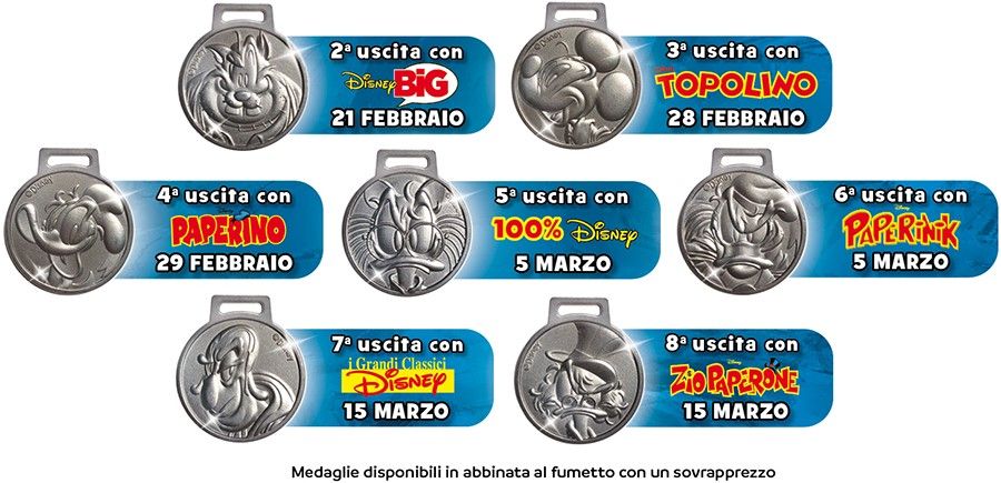 La seconda medaglia sarà disponibile con il numero 191 di Disney Big– in edicola, fumetteria e su Panini.it sempre dal 21 febbraio – la terza con Topolino 3562 da mercoledì 28 febbraio, mentre le restanti 5 medaglie saranno in allegato alle pubblicazioni dei mensili Panini Disney di febbraio e marzo (Paperino, 100% Disney, Paperinik, I Grandi Classici Disney, Zio Paperone). L’elenco delle uscite complete è consultabile su Topolino.it e sui canali social ufficiali del magazine.