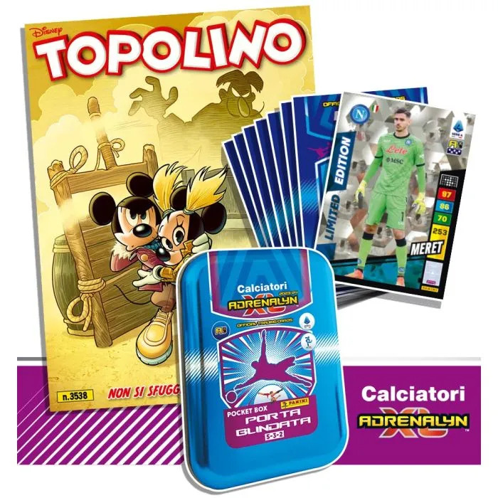 Con l’avvio della nuova stagione calcistica, Topolino rinnova il suo appuntamento con Calciatori Adrenalyn XL, la più celebre raccolta di card collezionabili Panini dedicate al campionato di calcio italiano, quest’anno giocando un ruolo chiave e davvero imperdibile per tutti i collezionisti. A partire da mercoledì 13 settembre con Topolino 3538, per 4 settimane, il magazine a fumetti più amato – disponibile in edicola, fumetteria e Panini.it – proporrà quattro tin box esclusive di Calciatori Adrenaline XL, contenente ciascuna 15 card di cui una in Limited Edition, utili a schierare una squadra adatta al modulo indicato. Si parte con la tin box Porta Blindata e la card esclusiva del portiere del Napoli Alex Meret. Si prosegue poi con Topolino 3539 e la box Muro d’Acciaio (con la card esclusiva di Davide Calabria, difensore del Milan), Attacco Stellare, in cui è contenuta la Limited Edition dell’attaccante del Monza Gianluca Caprari (con Topolino 3540) e infine, con il numero 3541 del 4 ottobre la box Cuore Pulsante, con il centrocampista del Genoa Milan Badelj. Una raccolta esclusiva ed un vero e proprio tesoro sia per gli amanti di Topolino sia per i collezionisti che vogliono completare la loro raccolta di Calciatori Adrenalyn XL con le card Limited Edition, altrimenti introvabili.