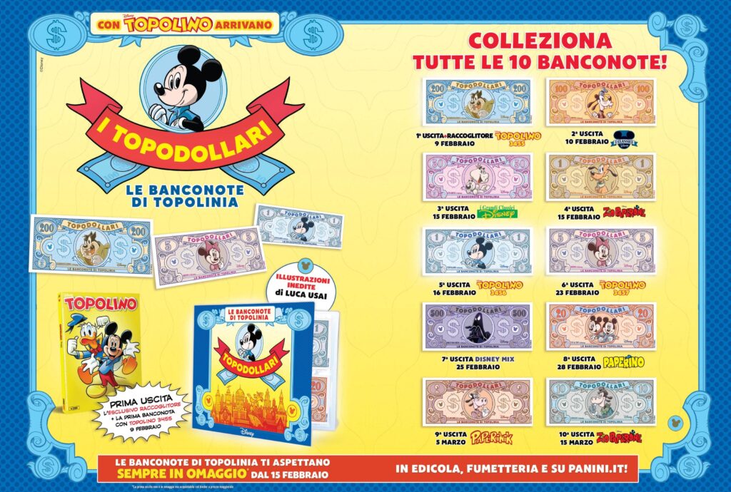 L’appuntamento con Topolino 3455 e con la prima banconota della preziosa collezione dei Topodollari è in edicola, fumetteria e su Panini.it a partire dal 9 febbraio.