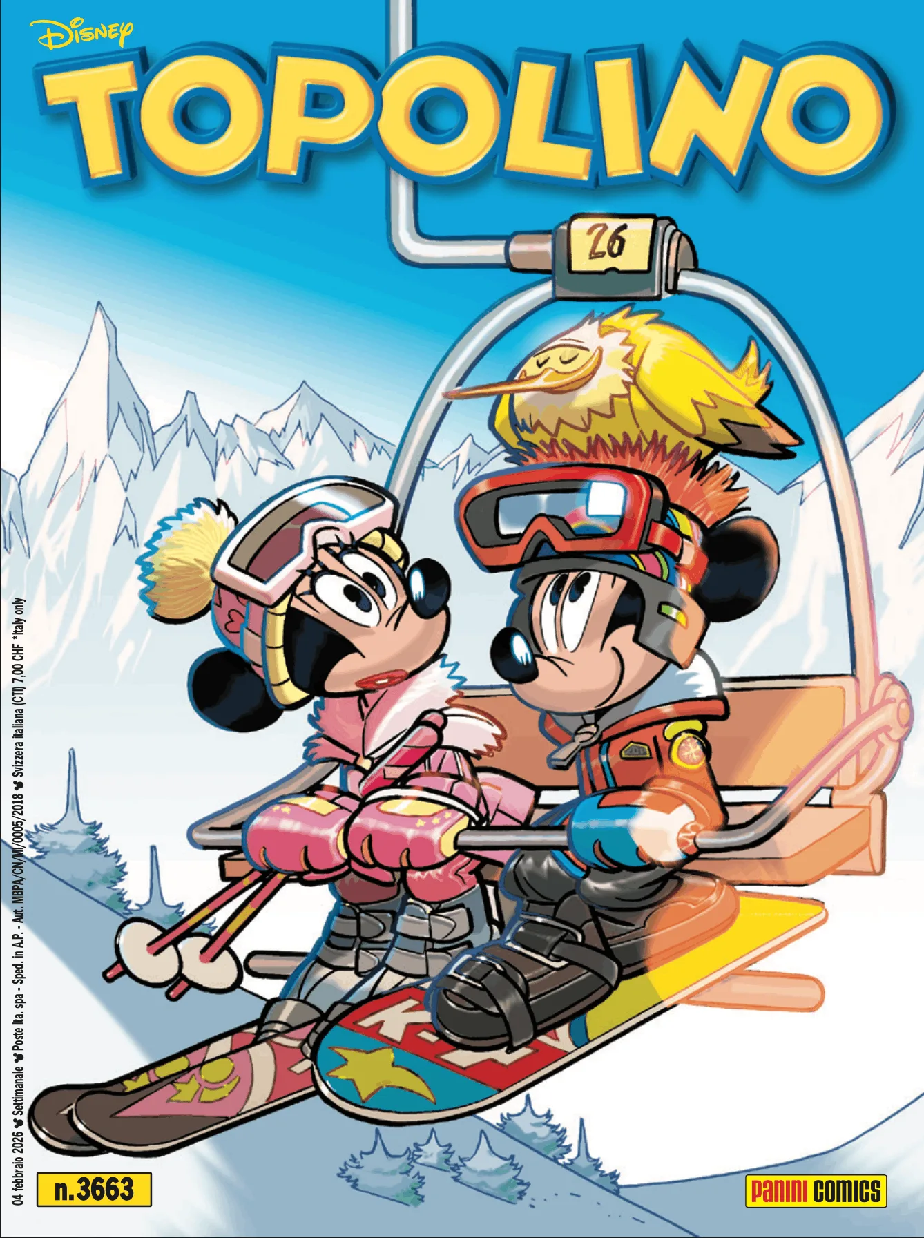 Sul numero 3663 del settimanale Topolino – in edicola, fumetteria e su Panini.it da mercoledì 4 febbraio – spazio agli sport invernali con la storia Pippo campione… freestyle, scritta da Rudy Salvagnini e disegnata da Carlo Limido, e con una splendida cover “innevata” realizzata da Corrado Mastantuono, con protagonisti Topolino e Minni in seggiovia. Il tema degli sport invernali proseguirà anche sul numero successivo del settimanale con Paperino e la disfida ghiacciata e Paperino campione intermittente, firmate da Alessandro Ferrari ai testi e Mario Ferracina ai disegni, per un doppio appuntamento sportivo che accompagnerà i lettori durante le settimane più fredde dell’anno.