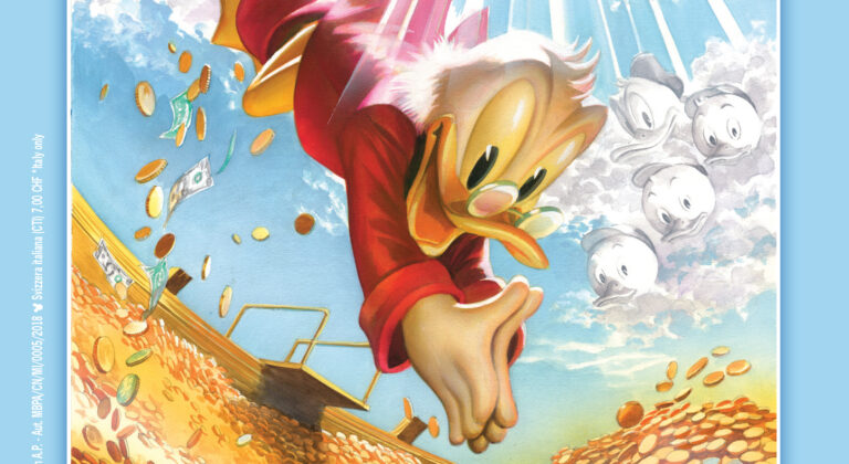 In Zio Paperone e il decino dell’infinito i lettori potranno poi ritrovare i tratti inconfondibili di un quintetto di italianissimi disegnatori che hanno dato vita alla vivace sceneggiatura del fumettista statunitense, mentre la coloratissima cover che apre la storia è di Lorenzo Pastrovicchio.Proposta in calce al numero e con senso di lettura rovesciato rispetto a quello tradizionale, ci sarà anche la spettacolare cover firmata dal leggendario Alex Ross, che racconta: «Ho dipinto tutto a mano con colori ad acquerello gouache, cercando di ottenere un effetto più opaco, come il lavoro di Barks. Ho aggiunto più aerografo per modellare e sfumare la figura e il cielo, cercando di ottenere una finiturapiù pulita».