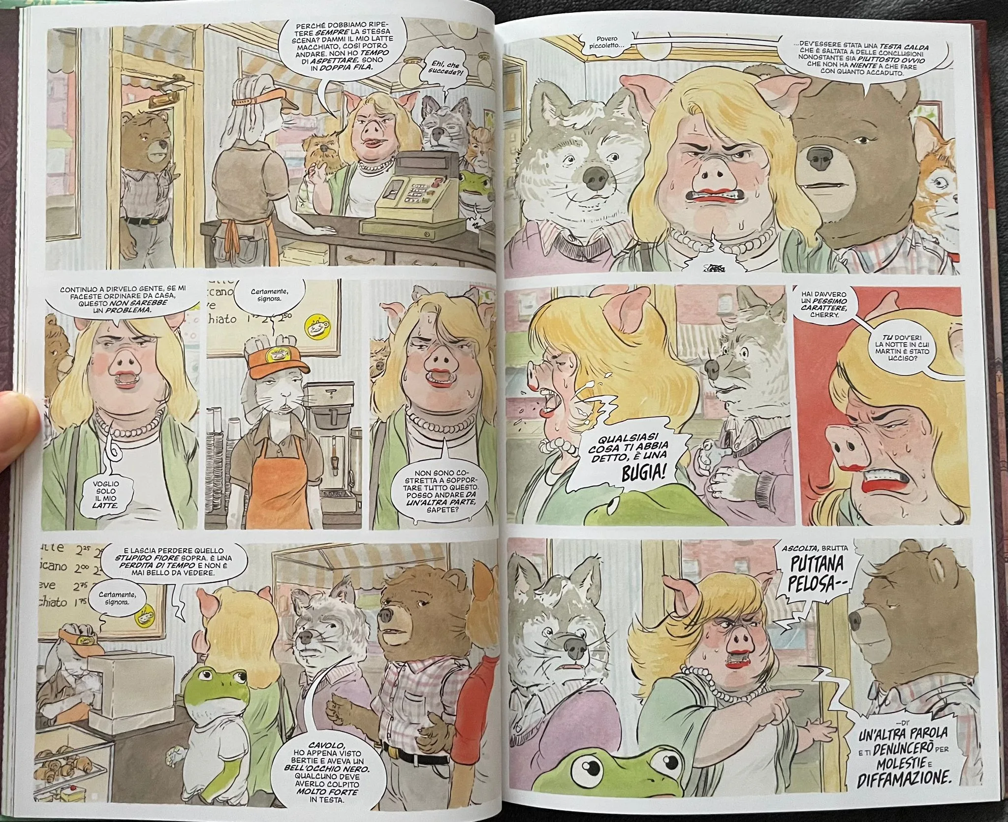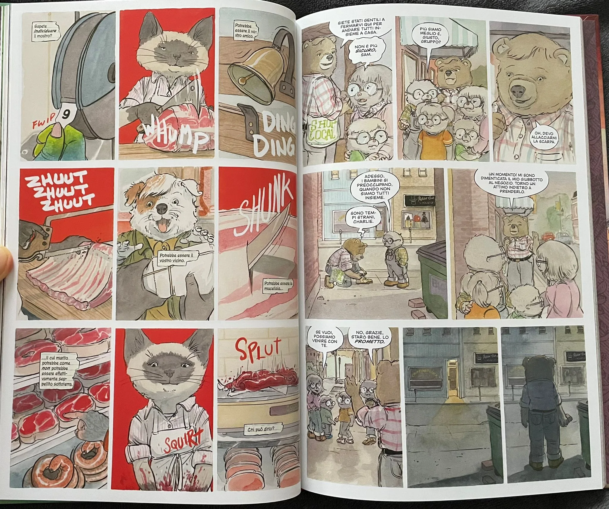 Questa dualità che sta alla base di Tra gli alberi dove nessuno ti vede è un tema esplorato in moltissime storie e che non brilla di troppa originalità, ma Patrick Horvath riesce a veicolarlo al meglio e a renderlo più interessante grazie alla sua arte e a un ottimo cast di personaggi. Gli animali antropomorfi di Woodbrook sono davvero realistici e umani, ognuno con le proprie peculiarità. Ad esempio, Charlie, il collega di Samantha, è sempre buono con tutti ed entrerà subito nel vostro cuore, al contrario, probabilmente, di Cherry Gherkins, che, dopo il primo omicidio, si mostra scontrosa e maltratta tutti, vedendo ognuno con sospetto. In ogni caso, il killer è pronto a mietere vittime e forse è bene non affezionarsi troppo ai personaggi.