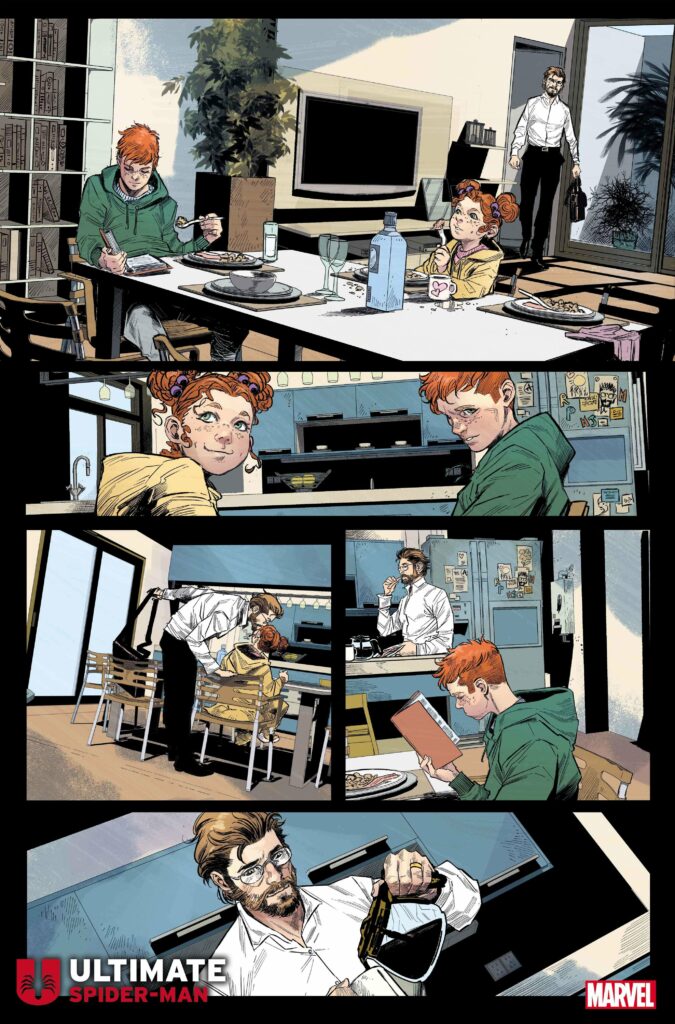 Il trailer di Ultimate Spider-Man #1 si basa sul tema “Meet the Parkers”, con un barbuto Peter Parker sposato con Mary Jane Watson, con una coppia di bambini dai capelli rossi. Naturalmente, un fumetto di Spider-Man non sarebbe lo stesso senza la sua classica rogues gallery, e Kingpin e Green Goblin sembrano essere i suoi primi avversari.