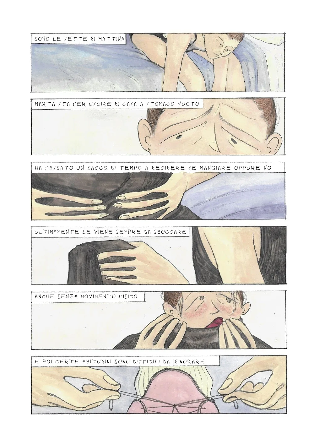 Il cuore del fumetto sta proprio nella sua capacità di raccontare il tempo sospeso, quello che spesso scivola via inosservato. Marta, Susanna e Gianni condividono spazi e momenti con una naturalezza disarmante: una passeggiata al parco, una serata davanti alla tv, una stanza in cui il telegiornale si mescola con il sonoro indistinto di un film. Il tutto avviene in un’ambientazione che non ha bisogno di essere descritta nei dettagli: è quella che conosciamo tutti, fatta di mobili familiari, luci soffuse, forse un po’ di disordine. I personaggi parlano poco, ma non c’è mai davvero silenzio. Ci sono i rumori della casa, i pensieri non detti, la semplice consapevolezza di non essere soli. Ed è proprio questa delicatezza narrativa che colpisce: Montagnoli non forza mai la mano, non cerca svolte drammatiche o colpi di scena, ma lascia che siano le sfumature a raccontare.