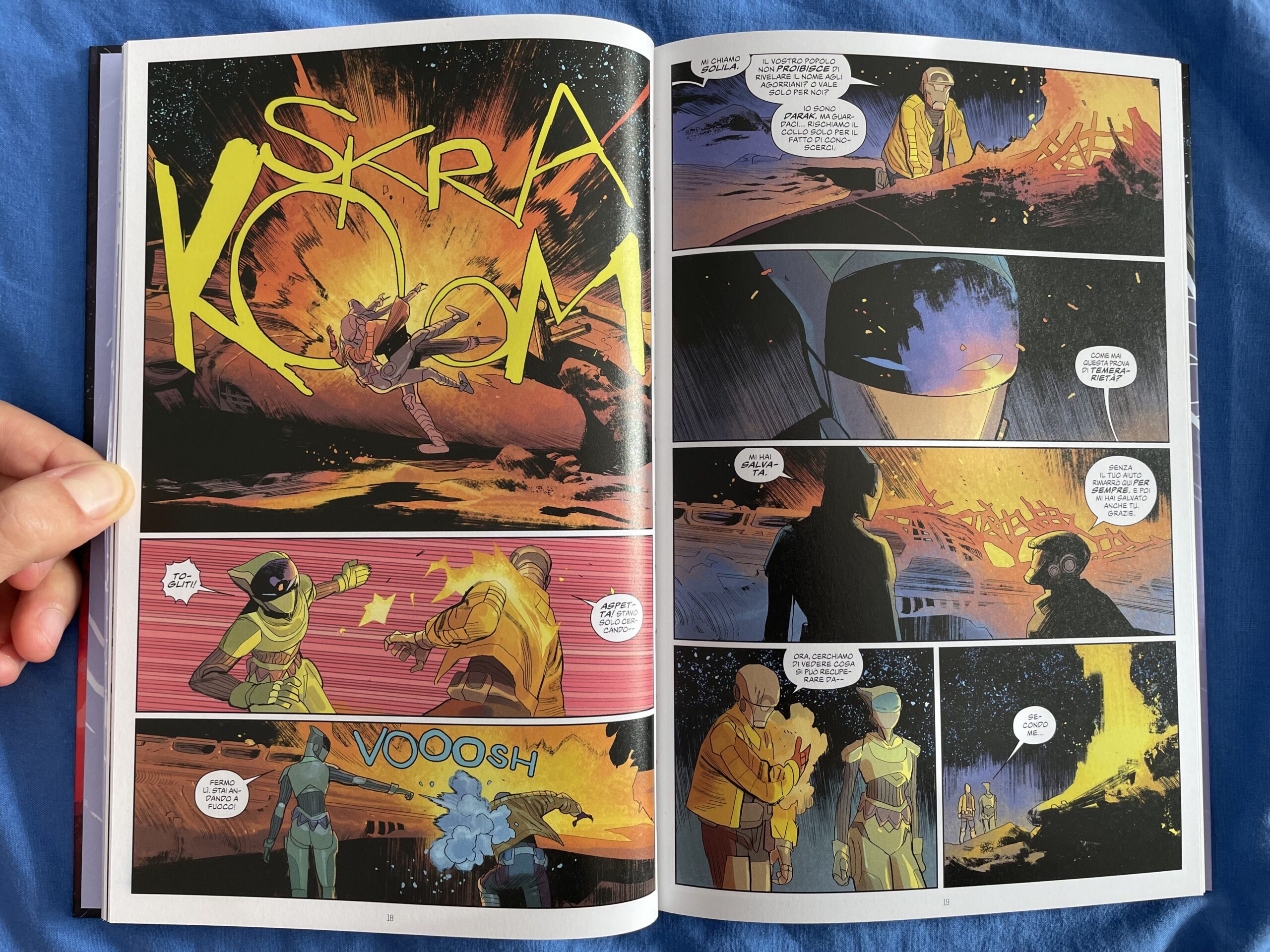 Nel loro tentativo di collaborare e ritrovare la via di casa, i due protagonisti capiscono che l’universo è ben più vasto e ricco di segreti di quanto avrebbero mai potuto pensare. Lo stesso pianeta che li ha fatti conoscere, nasconde un’altra presenza che si rivelerà molto familiare a tanti lettori e lettrici e che ritroveremo presto su altre pagine dell’Energon Universe. In questi primi sei numeri, Darak e Solila si troveranno alle prese con alcune creature aliene, fino al ritorno in un paesaggio familiare, ma forse non più così amico. I leader dell’Anello Sacro stanno nascondendo oscuri segreti, che la popolazione non deve conoscere, e chi sa qualcosa deve essere messo a tacere.