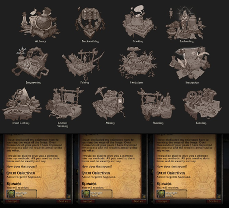 In passato il gioco ha avuto questi fantastici stemmi per rappresentare le fazioni e le classi, ma non ha mai avuto nulla per rappresentare le professioni fino ad ora. I designer si sono ampiamente ispirati agli oggetti di scena del gioco, che Joanna e il suo team hanno inserito nell’interfaccia utente per rappresentare ogni professione. “Il nostro obiettivo era quello di far sì che ogni stemma raffigurasse gli strumenti e gli oggetti con un senso di mistero che spingesse l’utente a esplorare la propria professione e a vedere tutto ciò che ha da offrire”, ha continuato Joanna.