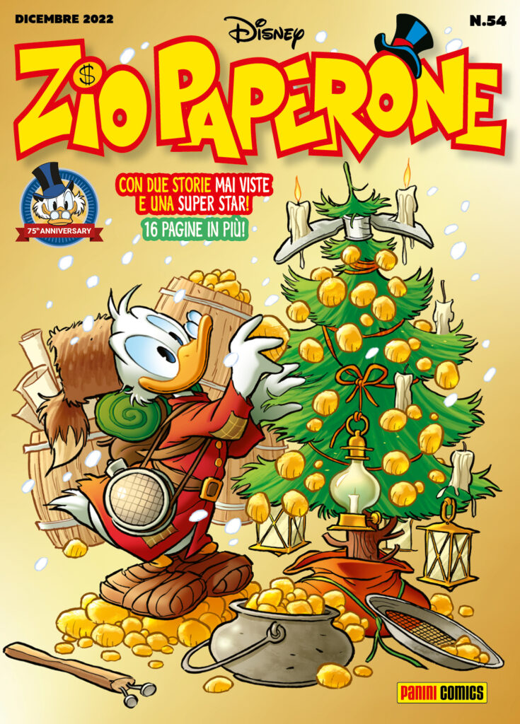 Infine, immancabile l’appuntamento mensile con Zio Paperone, il magazine dedicato allo Zione che con il numero 54 (in edicola, fumetteria e su Panini.it da giovedì 15 dicembre) avrà 16 pagine in più e una speciale copertina dorata. Questa uscita dedicata all’anniversario proporrà una selezione di storie appassionanti, a partire da Zio Paperone e la corona dei desideri, nella quale lo Zione e i nipoti vanno nei Caraibi a caccia di un tesoro, e Zio Paperone in… un altro Natale sul Monte Orso di Tito Faraci e Giorgio Cavazzano, sequel ideale della nota storia di Carl Barks. Torna inoltre Don Rosa con Zio Paperone e l’ultima slitta per Dawson, grande storia Superstar legata all’epopea del Klondike.