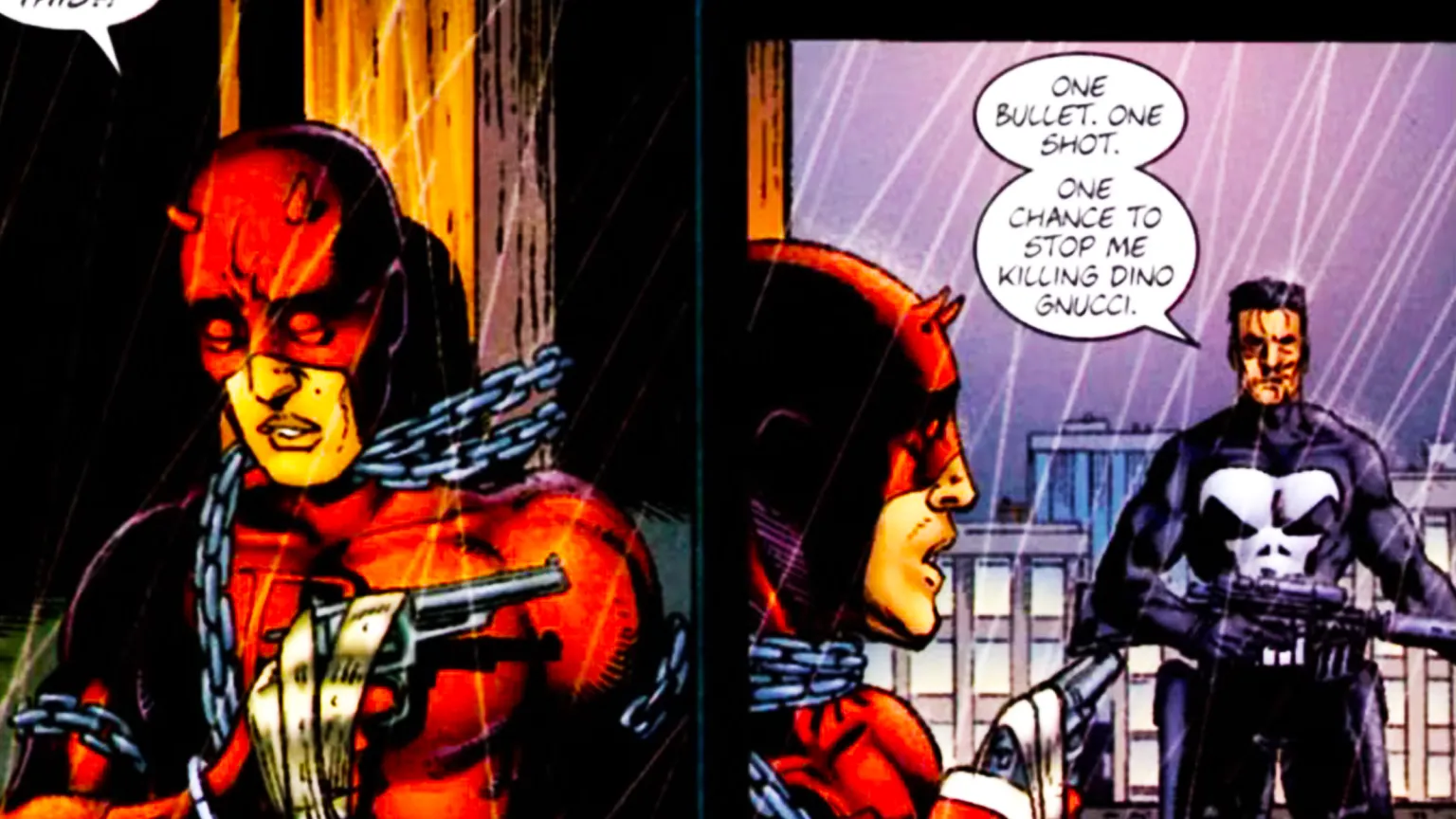 Nella seconda stagione di Daredevil (2016), Frank Castle (Jon Bernthal) incatena Daredevil (Charlie Cox) a un tetto per costringerlo ad assistere a un’esecuzione. Questa scena deriva da The Punisher (Vol. 5) #3 del 2000, ed è una delle più famose del fumetto. La trasposizione televisiva è quasi identica, con la stessa intensità morale e visiva.