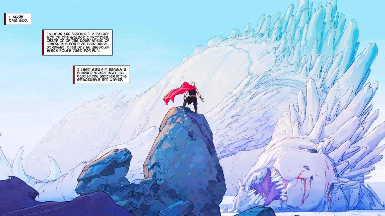 Una delle scene visivamente più spettacolari di Thor: Love and Thunder (2022) è l’immagine di Thor e Korg davanti al cadavere di Falligar il Behemoth, ucciso da Gorr il Macellatore di Dei. La vignetta originale si trova in Thor: God of Thunder #3 (2012), e il film la riproduce in maniera quasi fotografica.
