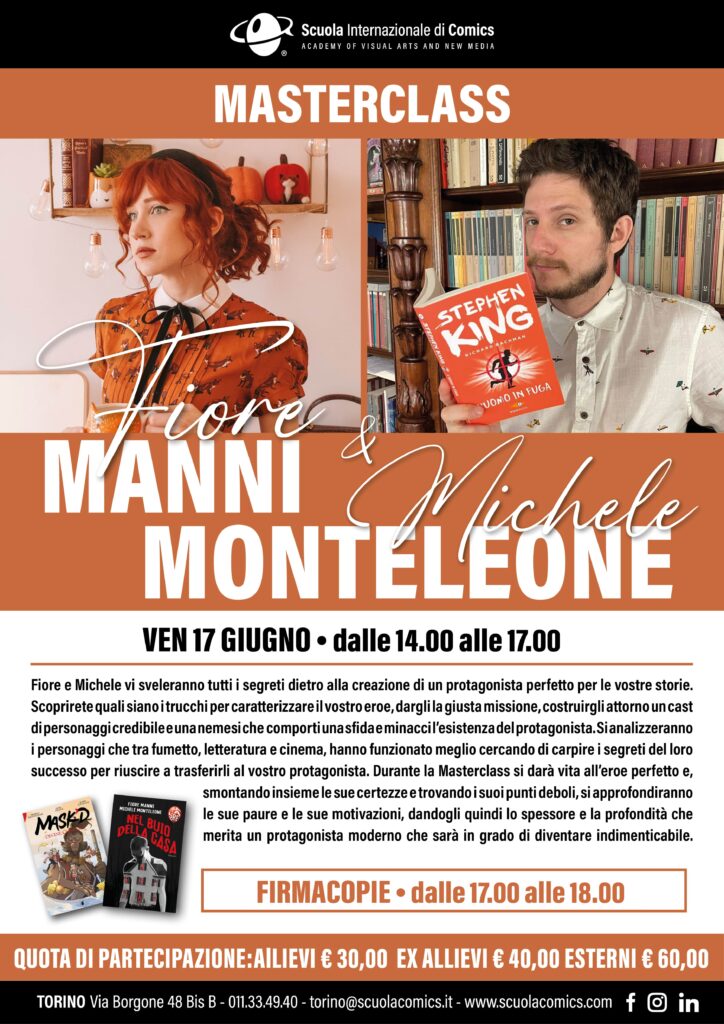 Fiore Manni e Michele Monteleone sono una coppia di giovani e importanti autori del panorama narrativo e fumettistico contemporaneo e, oltre all’appuntamento live di martedì 14, saranno protagonisti anche di una imperdibile Masterclass della durata di tre ore, intitolata È VIVO, È VIVO: COME DARE VITA AL PROPRIO PROTAGONISTA PER CREARE STORIE INDIMENTICABILI, che svelerà tutti i segreti dietro alla creazione di un protagonista perfetto per le storie di chiunque. Per iscriversi e per avere informazioni è sufficiente scrivere a torino@scuolacomics.it