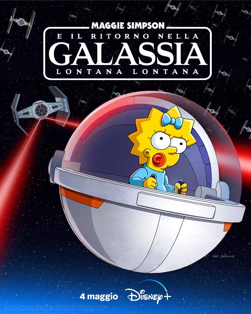 Disney+ ha annunciato che Maggie Simpson e il ritorno nella Galassia lontana lontana, un nuovo cortometraggio de I Simpson, debutterà il 4 maggio in occasione dello Star Wars Day. Nel corto in uscita, Homer perde le tracce di Maggie che sale sulla carrozzina volante di Grogu per un’avventura nell’iperspazio attraverso la galassia. Affrontando uno squadrone di caccia TIE imperiali, Maggie porta la battaglia a Springfield in questo epico cortometraggio che celebra tutto ciò che è Star Wars. La nuova key art offre ai fan un primo sguardo alle avventure di Maggie in una galassia lontana, lontana.