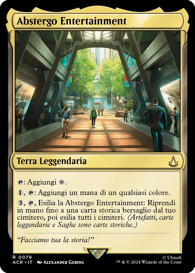 Ricorda che se qualcosa fa riferimento a lanciare una magia storica, Abstergo Entertainment non ti aiuterà perché giocare una terra è diverso da lanciare una magia. Abstergo Entertainment è comunque storica, quindi se ne controlli una e ne hai una nel cimitero, attivando l’abilità di una delle due potrai far tornare in mano l’altra.