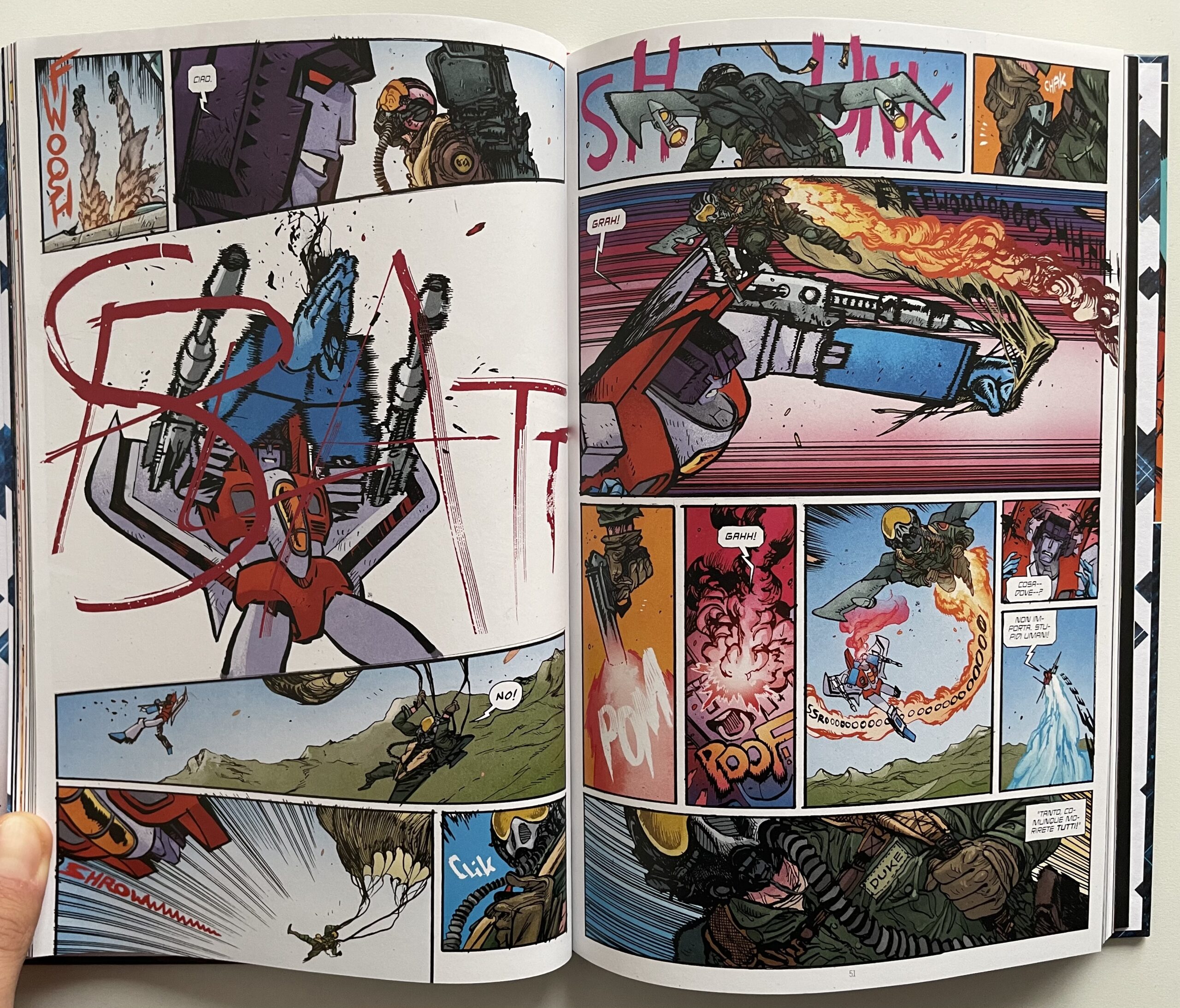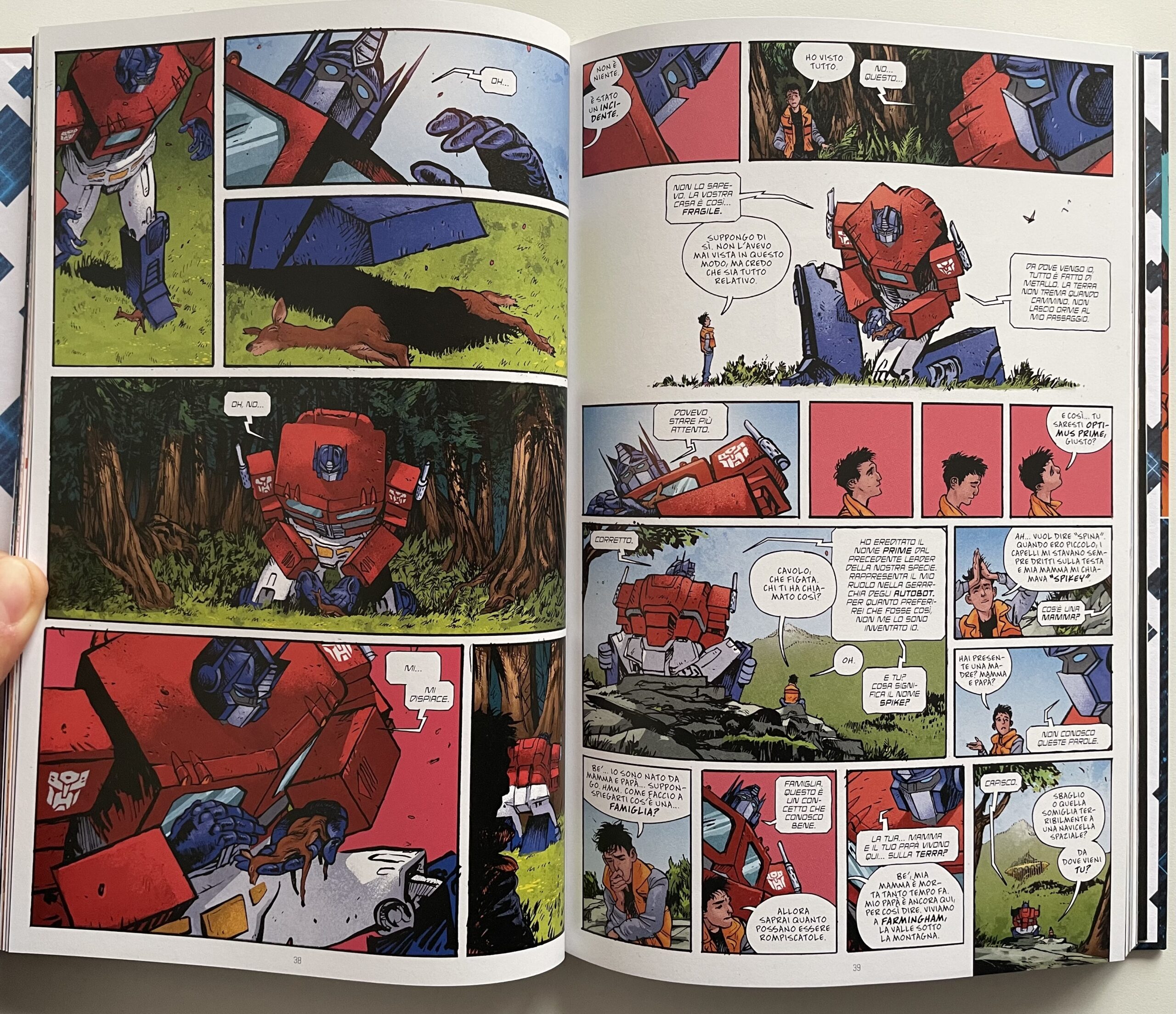 Transformers 1 – Robot in incognito raccoglie i primi sei numeri della storia, nei quali Daniel Warren Johnson mette tantissima carne al fuoco, ripescando elementi celebri del franchise senza snaturarli ma rinnovandoli ogni volta, a partire dai personaggi. Spike Witwicky ha perso la madre tempo prima e vive insieme al padre alcolizzato, con il quale non ha un buon rapporto. Vorrebbe diventare astronauta ma per il momento lo ha confidato solo alla sua amica Carly, con la quale condivide molte passioni e la voglia di evadere dal paese. Hanno entrambi un animo buono e si dimostrano molto coraggiosi, persino di fronte a una situazione così inaspettata. Dall’altro lato della barricata ci sono i robot, tanti volti ben noti ai fan di vecchia data, pur con una grande assenza, Megatron. A capo dei Decepticon troviamo infatti Starscream, brutale e implacabile come non mai. È lui più di tutti a dominare la scena e gli scontri che lo coinvolgono sono di una violenza forse mai così esplicita. Gli umani sono solo insetti da schiacciare…letteralmente!